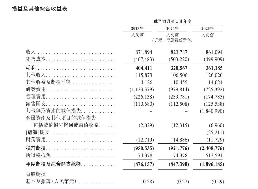 亮眼的市场表现背后,公司盈利压力依然突出。财务数据显示,2023年至2025年,公司营业收入分别为8.72亿元、8.24亿元、8.61亿元,同期净亏损分别为8.76亿元、8.47亿元及18.96亿元,三年累计亏损约36.19亿元。